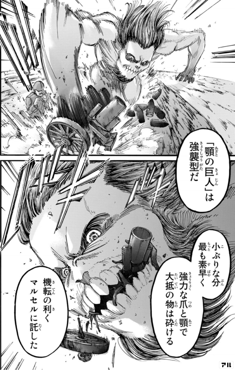 顎の巨人 は強襲型だ 小ぶりな分もっとも素早く 強力な爪と顎で 大抵の物は砕ける 機転の利くマルセルに託した 進撃の巨人 アル